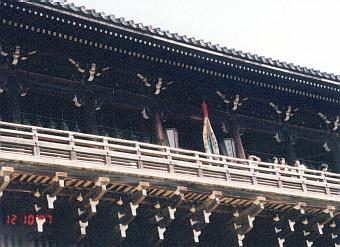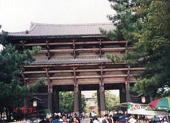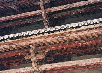 | 南大門 重層入母屋造りの門で、高さは25メートル。 現在のものは鎌倉時代(1199)に再建されたもので、大仏様式の代表作とされている。 門の両脇には、鎌倉時代の名仏師運慶と快慶が18人の弟子とともに72日かけて彫り上げた木像金剛力士像が立つ。 近年大修理がされてよみがえり、平成5年秋に落慶法要が行われたばかり。 右写真は、南大門の屋根組をズームで撮影しました。かなり古くなっています。 | |