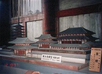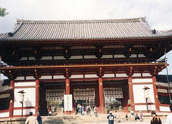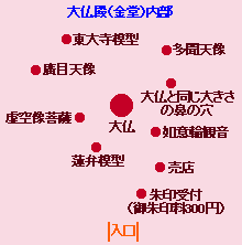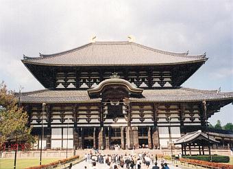 | 金堂(大仏殿) 東大寺の本尊である盧舎那仏を安置し、 大仏殿の名で親しまれている堂宇。 現在の建物は江戸時代(1709)に再建されたもの。 天平の創建当時のものに比べると東西が 約3分の2に縮小されてはいるが、 それでも木造建築としては世界最大の規模を誇る。 「奈良の大仏」と呼び親しまれている盧舎那仏坐像(国宝)は752(天平勝宝4)の開眼。天災や戦火にたびたび見舞われ、 幾度も補修されている。 現在の像は56葉の蓮華座に座り、高さ約15メートル、 顔の長さ約5メートル、中指だけをとってみても1.3メートルも あり重さは380トンと推定される。 |