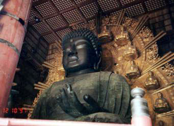 ◆大仏の鋳造◆ まず粘土で大仏の像を作り、 粘土像の表面に薄紙を貼り付ける。 その上からまた粘土を塗りつけ、それを薄紙とともに、はがし、 粘土像との隙間をつくるようにあてがう。 粘土同士の隙間に溶かした銅を下から8層に分けて、 流し込んで、鋳造されたと言われている。 表面は水銀と金を溶かしたものを塗られたとされている。 |
