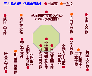 | 三月堂 拝観料400円 ◆不空羂索観音立像(ふくうけんさくかんのんりつぞう)◆ 天平時代の作。威厳に満ちた表情と見事な宝冠に目を奪われる。 独特の舟形光背に放射状の線が走る。手には魚や鳥を捕らえる道 具、羂索を持つ。 ◆日光・月光菩薩立像(にっこう・がっこうぼさつりつぞう)◆ 高さ約2メートル。均整のとれた姿、おだやかに澄み切った表情に気 品があふれる。 ◆梵天・帝釈天立像(ぼんてん・たいしゃくてんりつぞう)◆ 天平時代の乾漆像。目立たないが、両脇侍として風格がある。 ◆四天王立像(してんのうりつぞう)◆ 天平時代の乾漆像。高さ3メートル。邪鬼に精緻な技巧が。 ◆金剛力士立像(こんごうりきしりつぞう)◆ 須弥壇(しゅみだん)に向かって左が阿形(あぎょう)、左が吽形(う んぎょう)。天平時代の乾漆像で、高さ2.9メートル。 ◆執金剛神立像(しゅこんごうしんりつぞう)◆ 厨子の中に安置されている天平時代の秘仏。金剛杵(こんごうしょ) を持った右手を振り上げ、左手を張って構え、赤い口をカッと開いた 怒濤の顔。毎年12/6のみ開扉。 |